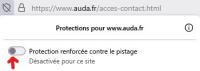 (NOTA : En cas de problème d'affichage du formulaire de contact ci-dessous (problème connu rencontré sous Firefox), désactiver la protection renforcée (cf ci-dessous), essayer avec Chrome ou Edge ou envoyer directement un mail à contact@auda.fr)
